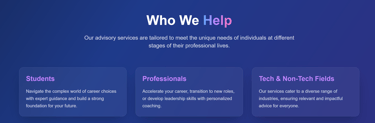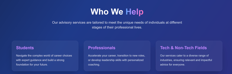 Full-spectrum career mentoring / guidance: education paths, skills maps, and personalized growth roadmap strategies.